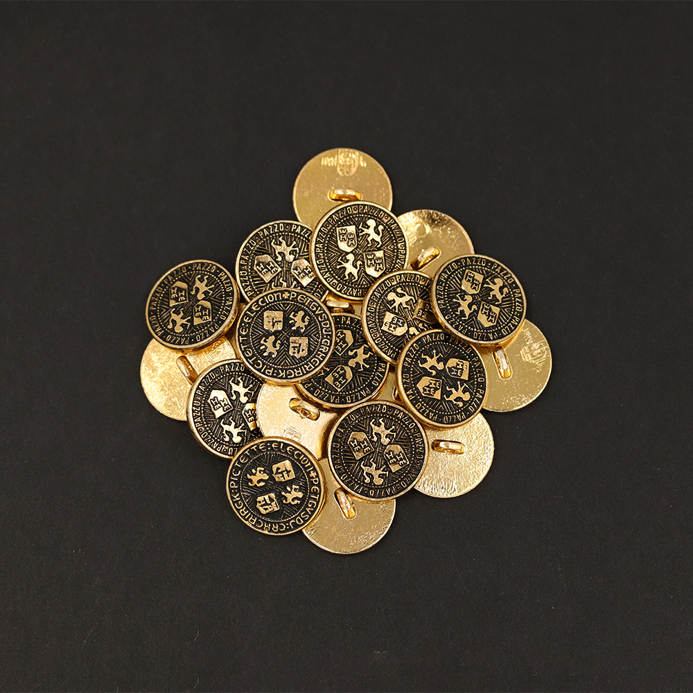 Sullivans 15mm Round Metal Shank Button With Emblems - Old Gold - 31 In A Tube